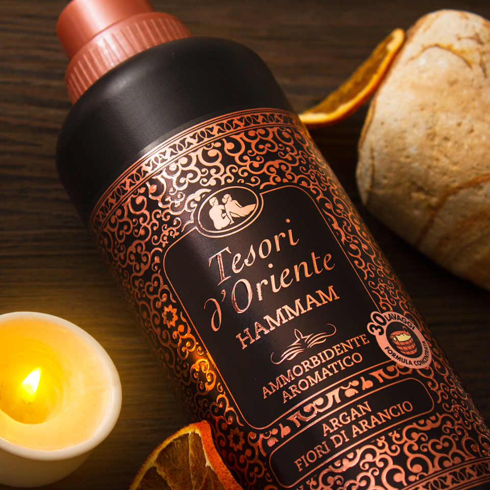 Płyn do płukania tkanin Tesori d'Oriente Hammam to orientalno-kwiatowy bukiet wzbogacony olejkiem arganowym, używanym od tysiącleci jako eliksir piękna.